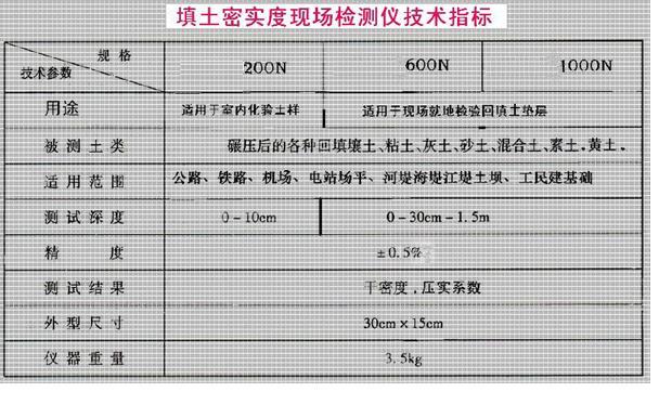 JK-WG-V型电子数显填土密实度检测仪每套包含三台:200N、600N、1000N各一台。它的特点是:不用取土现场就地原位测试,在碾压好的工作面上选取被测点,挖开表土,施加压力将圆锥探头压入土中,本机采用机电一体化集成电路数字显示检测结果。